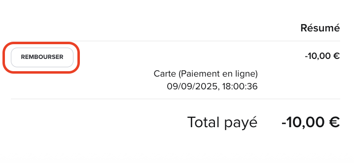 Une fois le ticket de vente annulé, si un paiement en ligne a été effectué (acompte ou frais d'annulation), un bouton "Rembourser" apparaît en bas de page.