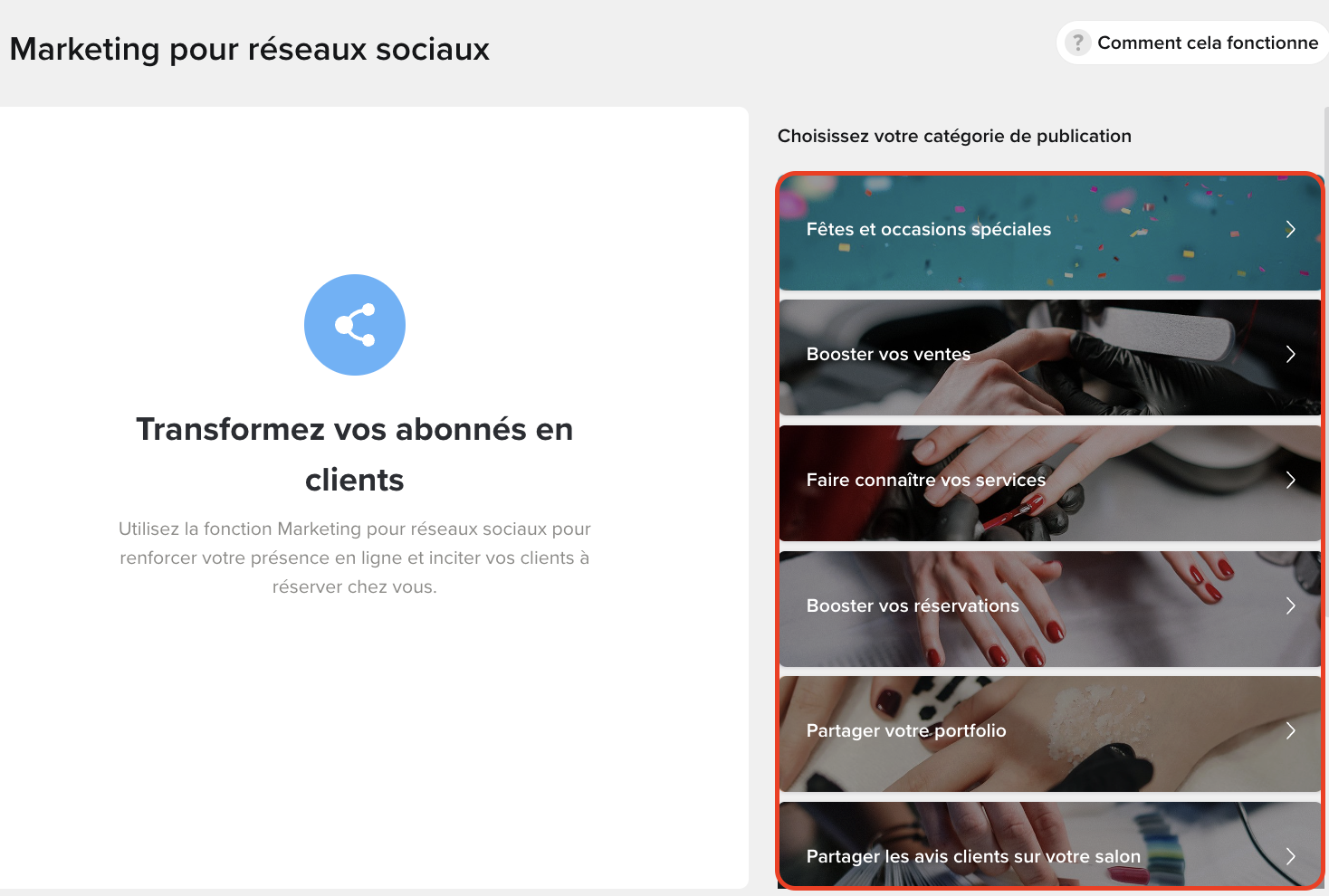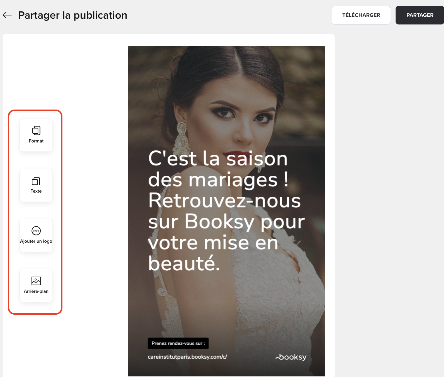 Arrêtez de jongler avec vos outils ! Booksy vous permet de créer facilement des visuels percutants et de les publier quand vous le voulez, pour toutes vos campagnes marketing.