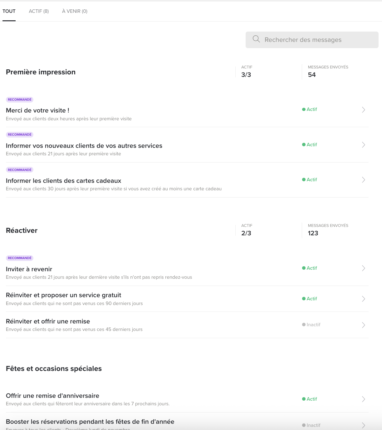 Vous pouvez choisir d'activer ou non les campagnes de votre choix. Vous pouvez également paramétrer le moment de leur envoi.