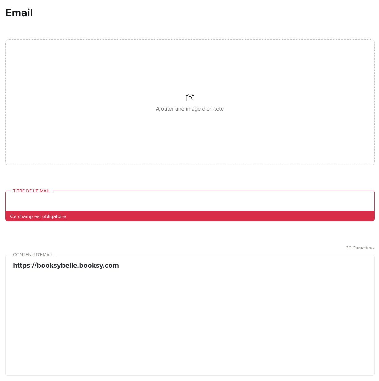Emails : Vous pouvez ensuite choisir une image pour votre campagne marketing email, ajoutez son titre et son corps de texte.