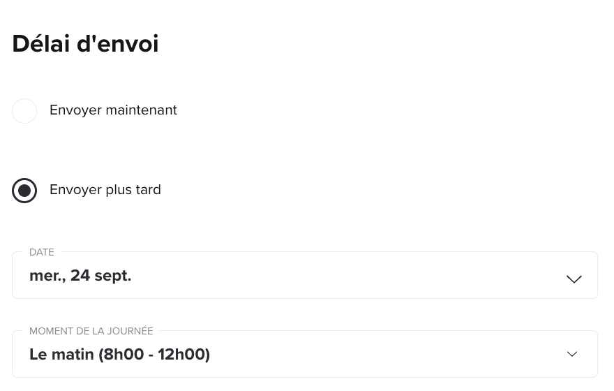 Vous pouvez choisir d'envoyer votre campagne maintenant ou de l'envoyer plus tard ou choisissant la date et le créneau de votre choix :