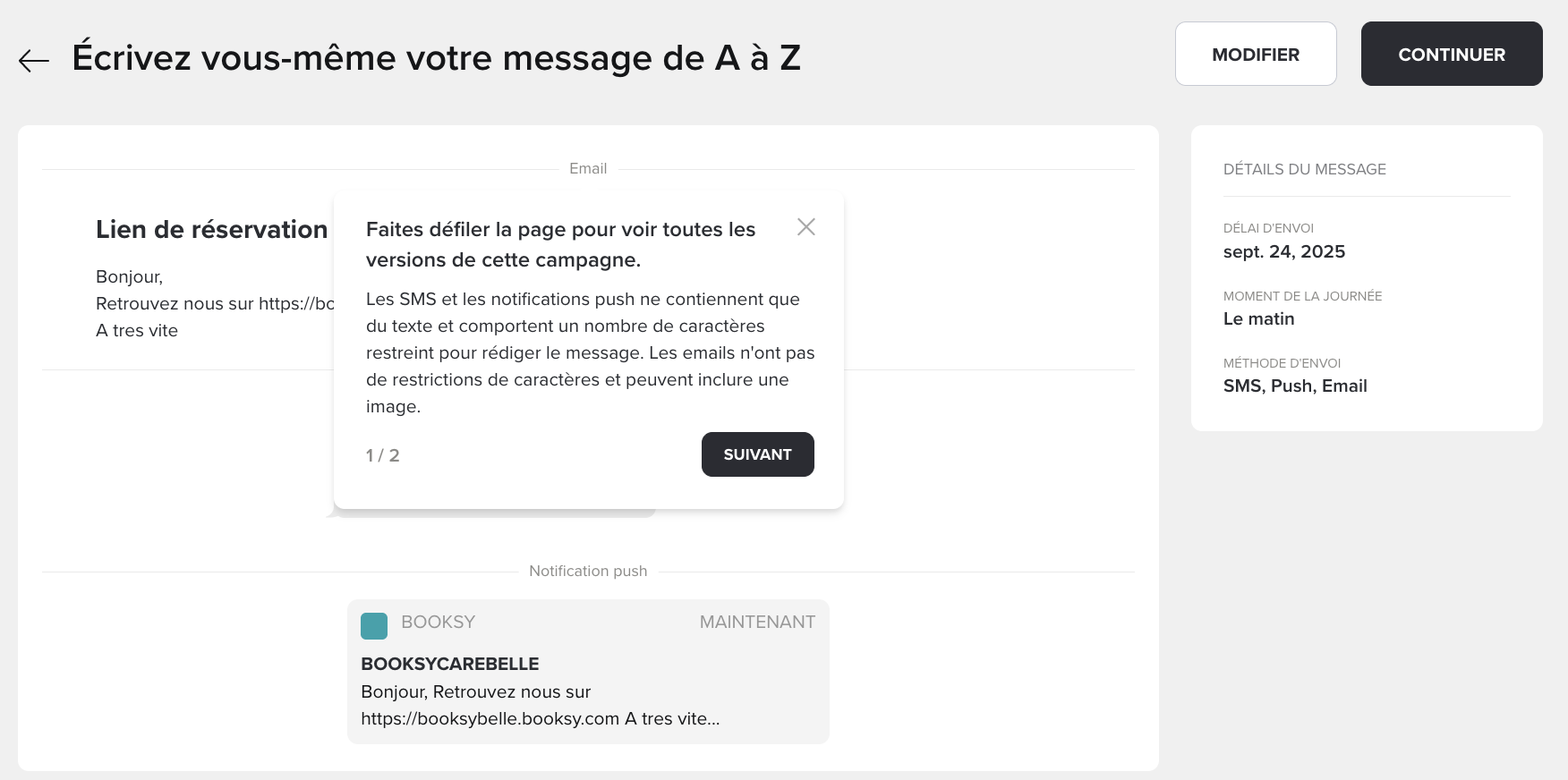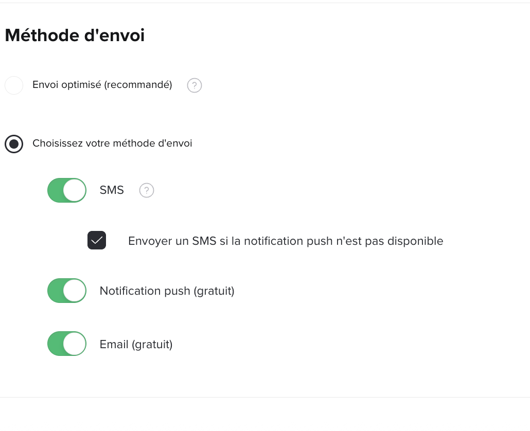 - Envoi optimisé : l’algorithme détermine automatiquement le canal le plus efficace en fonction des préférences et comportements de vos clients. Les emails et les notifications push sont toujours gratuits.