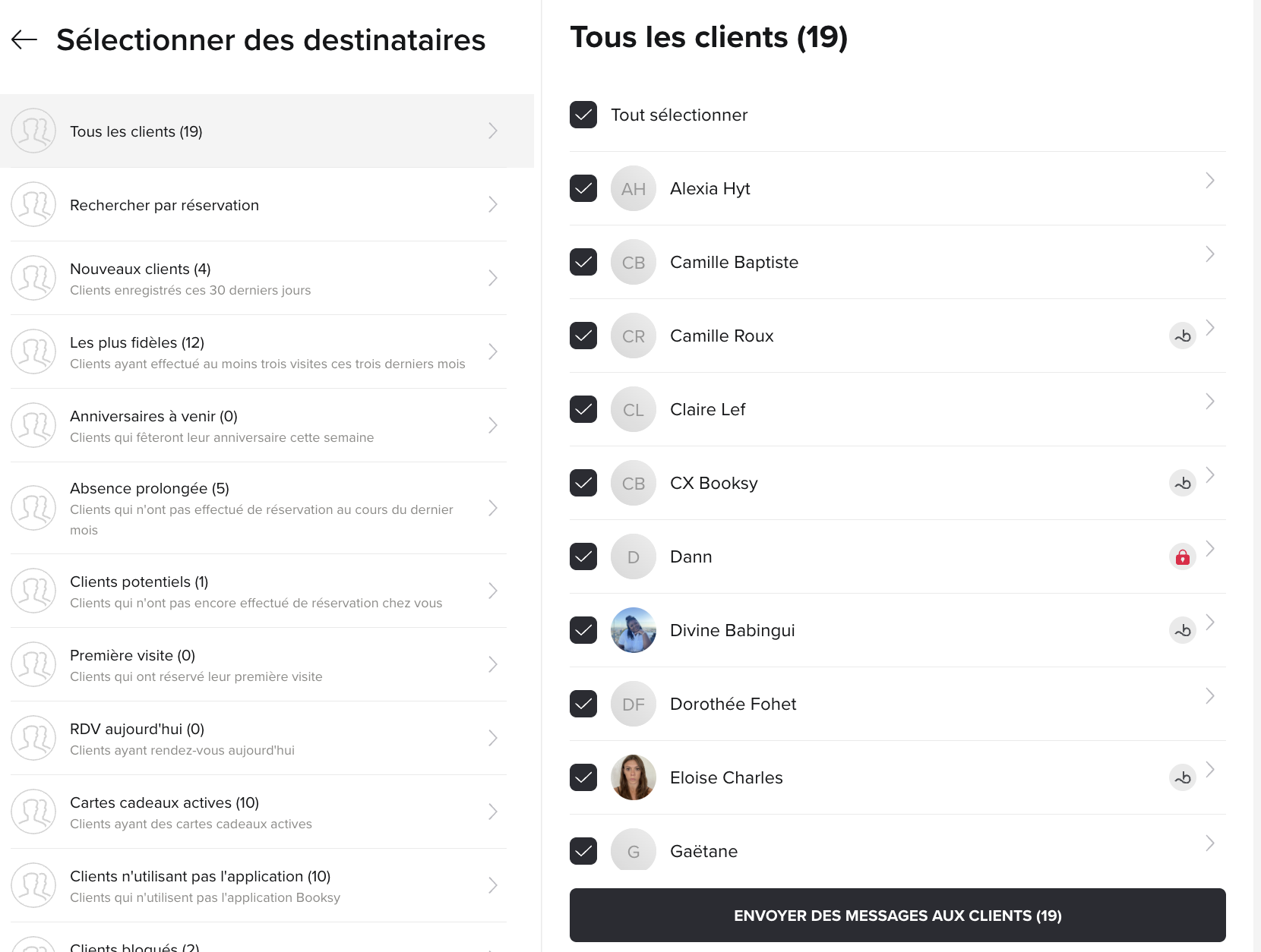 Vous pouvez sélectionner manuellement les clients ciblés ou utilisez les # pour les différents groupes que vous avez crée au préalable
