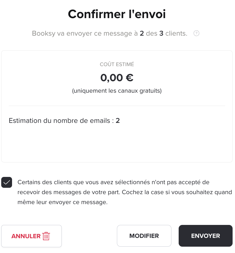 Avant de confirmer l'envoi, vous aurez toujours un aperçu du coût de la campagne.